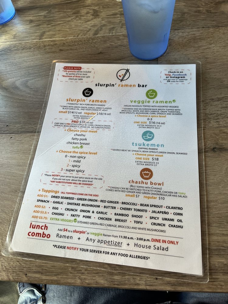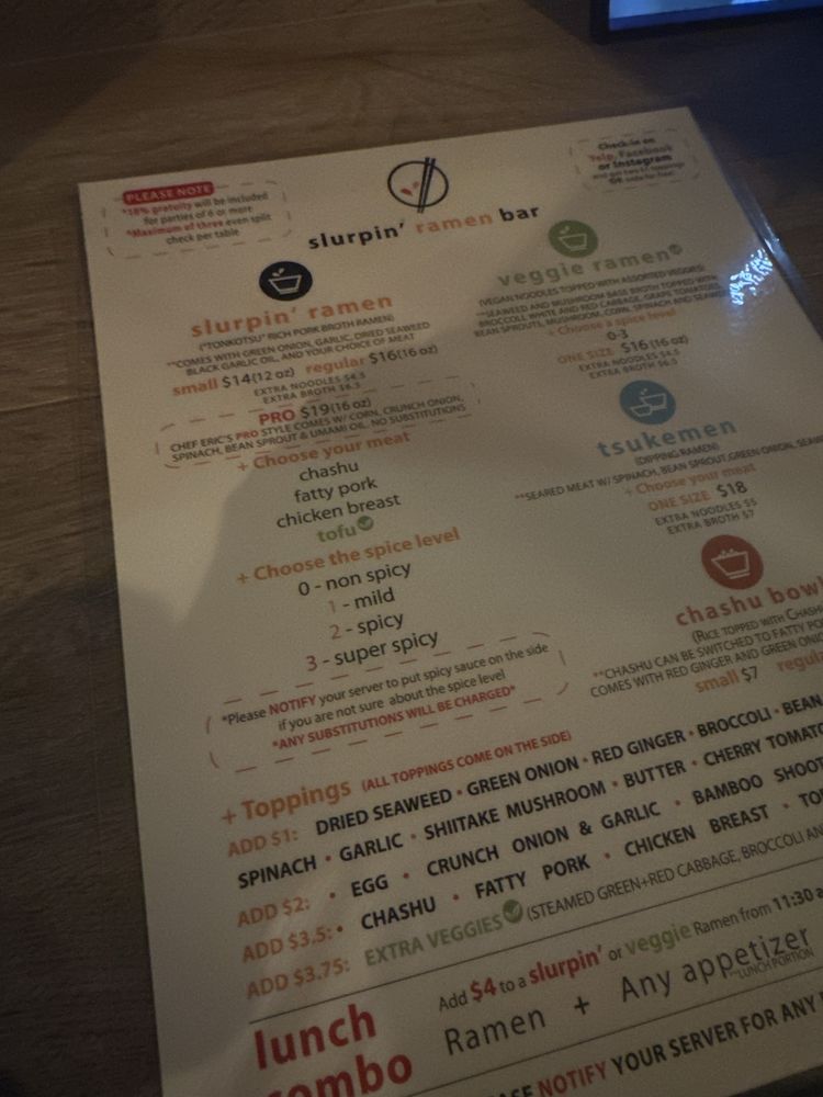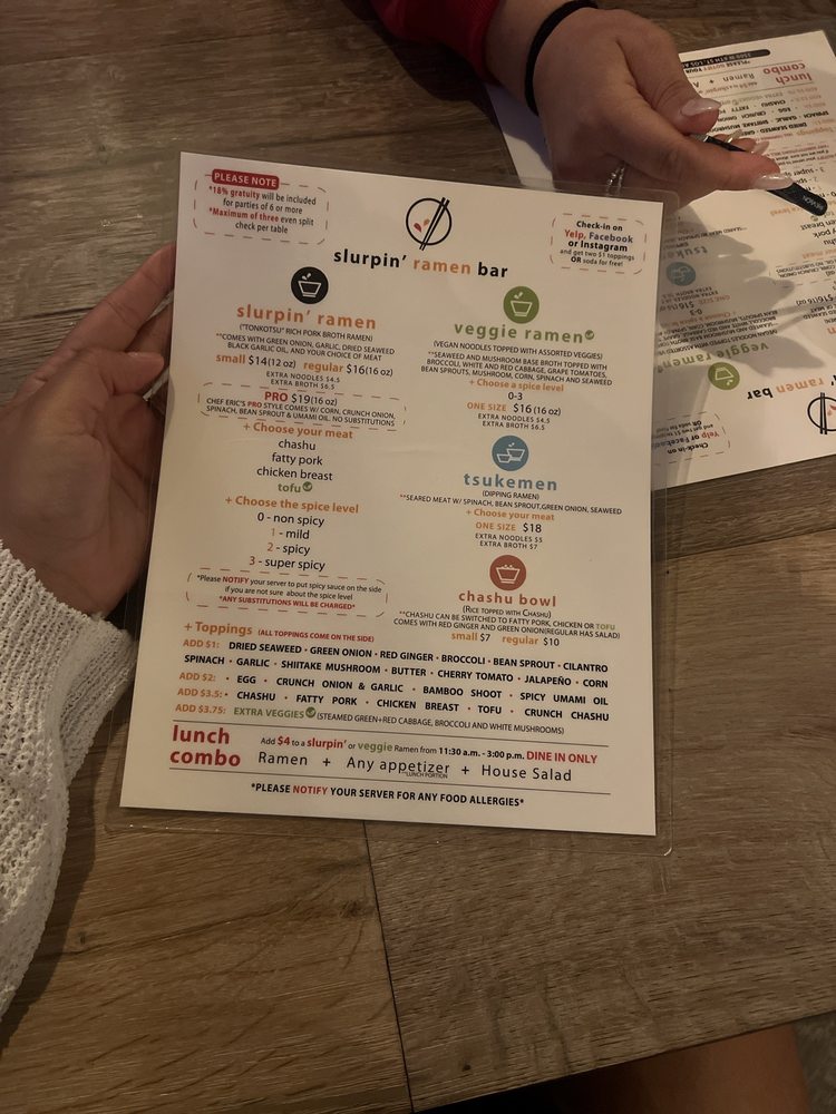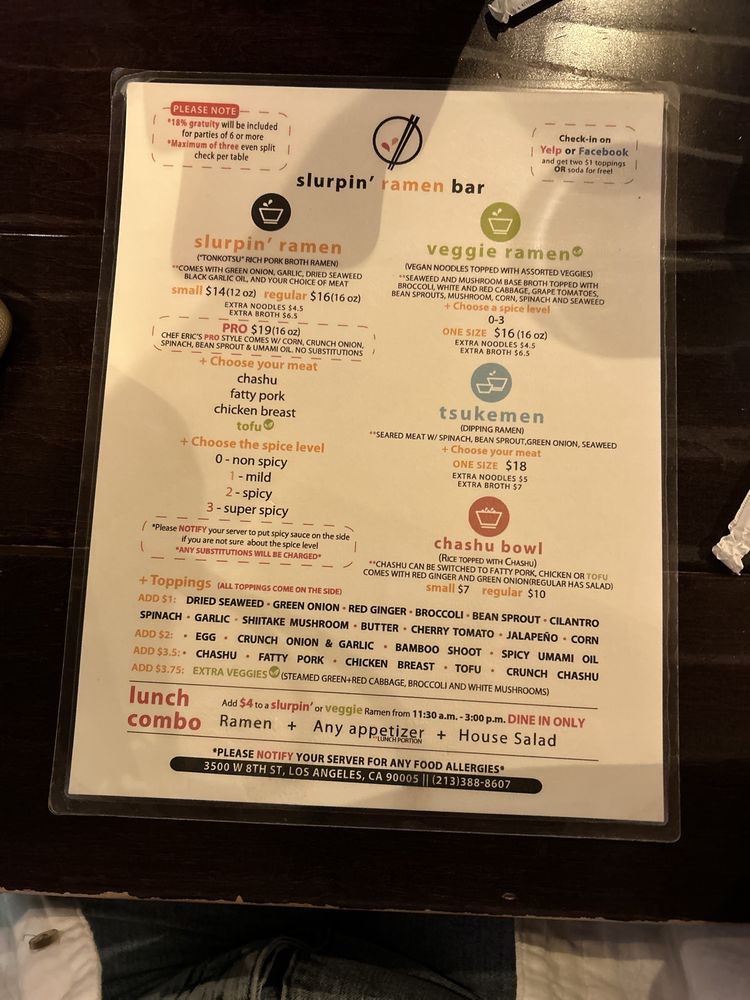 Slurpin’ Ramen Bar in Los Angeles offers a diverse menu of ramen options, including the Tonkotsu Rich Pork Broth Ramen and Veggie Ramen with vegan noodles and assorted vegetables. Toppings range from cherry tomatoes to fatty pork, providing customization for every palate. The ramen is described as flavorful and rich, with perfectly cooked noodles and a savory yet creamy broth. Customers praise the generous portion sizes and quick, friendly service. Despite its slightly chaotic exterior, the restaurant's interior provides a cool and intimate dining experience. Offering diverse options for dietary preferences and a solid selection of toppings, Slurpin’ Ramen Bar is a gem for ramen lovers in Koreatown.