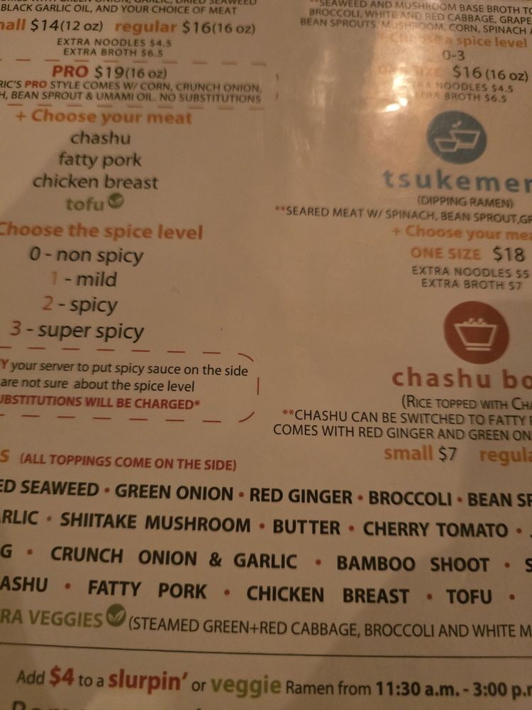 CHASHU CAN BE SWITCHED TO FATTY PORK, CHICHEN OR TOFU COMES WITH RED GINGER AND GREEN ONION (REGULAR HAS SALAD)